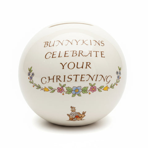 This is a round moneybox in the Royal Doulton Bunnykins range. It depicts a Bunnykins Christening scene taking place at the font in a church.