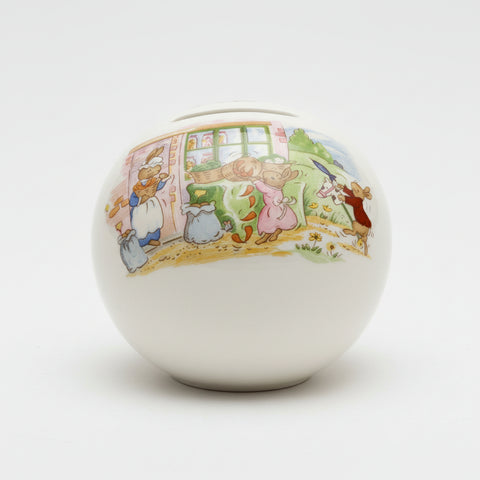 This is a round moneybox in the Royal Doulton Bunnykins range. It depicts children Bunnykins helping collect vegetables in their baskets.