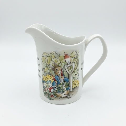 This is the milk jug in Wedgwood's Beatrix Potter Peter Rabbit pattern, part of the Wedgwood nursery ware range inspired by the stories and illustrations of Beatrix Potter.